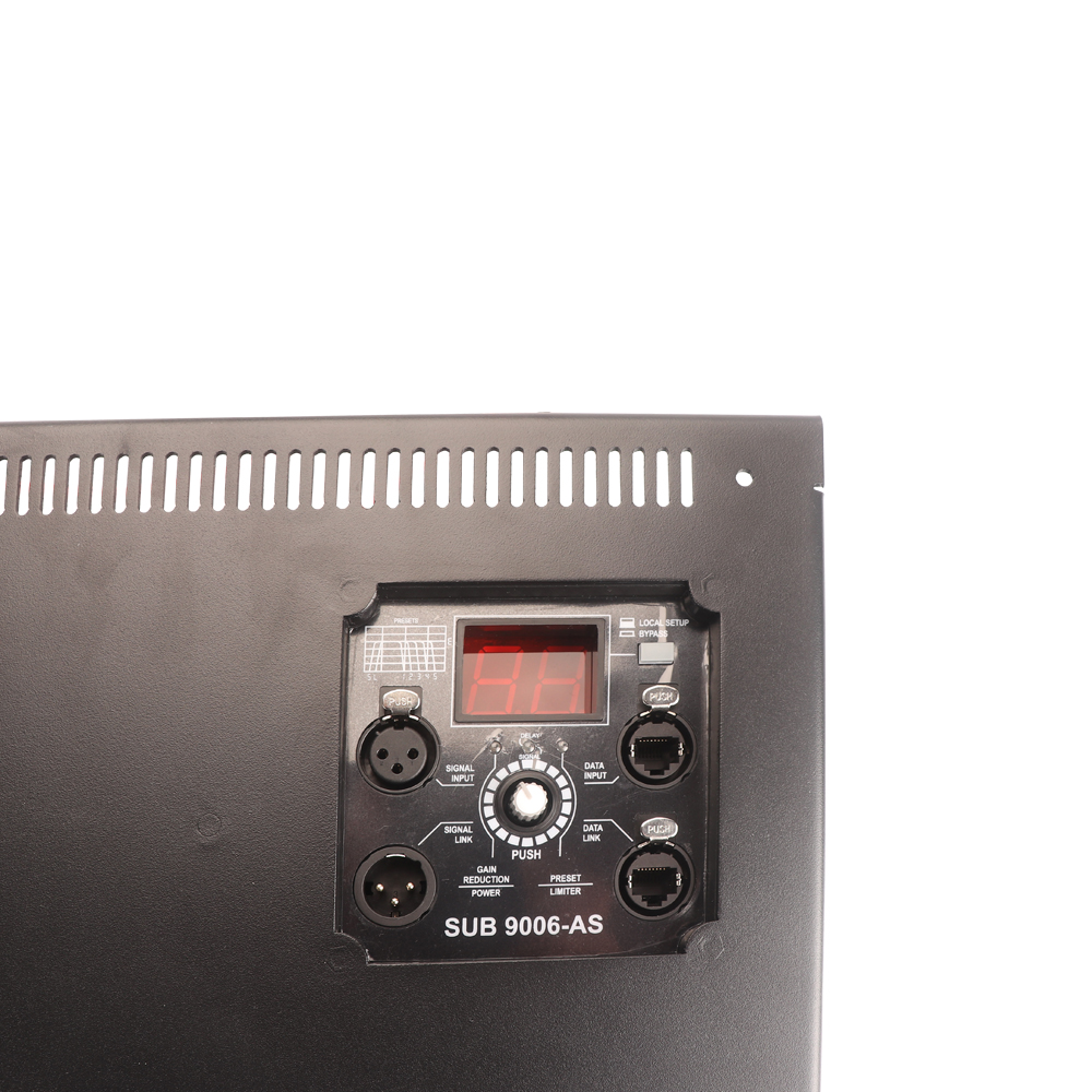 The available control panel on the back adjusts input sensitivity, Low Cut, Xover, volume, bypass, delay and presets selection.